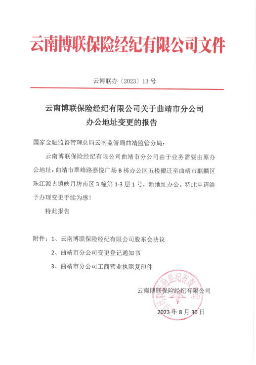 云南博聯(lián)保險(xiǎn)經(jīng)紀(jì)有限公司關(guān)于曲靖市分公司辦公地址變更的報(bào)告