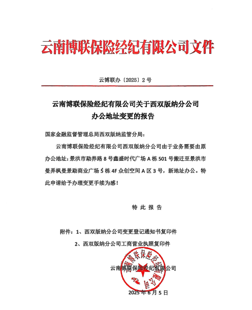 云南博聯(lián)保險經(jīng)紀(jì)有限公司關(guān)于西雙版納分公司辦公地址變更的報告