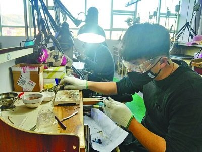 在珠寶加工工作室里,一排排機(jī)器后面,大學(xué)生們正低著頭專心致志加工玉石,有的在雕刻,有的在打磨,其中還有8位來自緬甸的留學(xué)生。緬甸留學(xué)生相猛江用不太熟練的漢語對記者說:"我來了7個月,正在學(xué)習(xí)雕刻玉馬。"